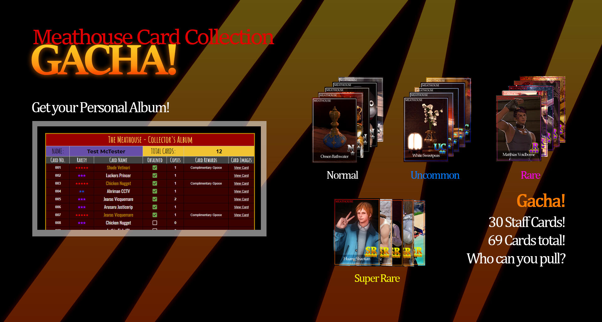 We heard you like Gacha. Its the HOT things these days.SO WE BRING YOU GACHA.Meathouse brings to you our very own collection of Collectable Cards, with various in-venue objects, concept and of course, our Very Hot Staff.